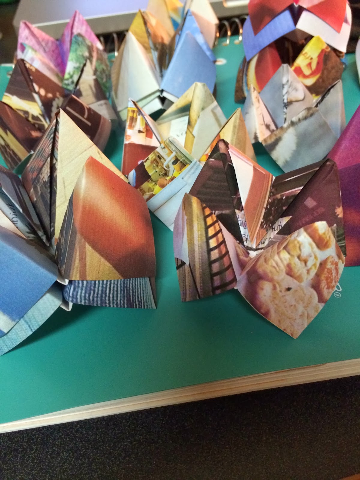 When first assigned this project, I was sure that I had it in the bag. I would take pictures of what I felt represented my life, and hopefully present them in a creative, vintage way that would represent my style and taste. The first part went well, above you will see 20 photos that begin to represent me as a person; they display people and places I love, my vegan lifestyle, my leisure activities, my favorite foods and animals, and mementos that are important to me. However, when it came to displaying these creatively in a way that showed something I care about, I struggled greatly. I first attempted polaroids, not real ones, but printing the pictures and leaving white edges to give a polaroid effect. It had the vintage feel I was looking for, but it was completely overdone, so that idea was tossed. Then, as I hunted for inspiration in local stores, I remembered the art of the "newspaper nails," where one can dip their finger in rubbing alcohol and press newsprint on their nail, and it will stick. I assumed the printed photos would work the same way, and that I could actually wear them on my nails. After buying all of the supplies, I soon came to find that this was not the case. Another failed attempt had been made. Finally, just in time, the idea to create each photo into a fortune teller came to me. I can't quite recall how it did, but I knew it was the right choice for my project for more than one reason. First off, each of these pictures show something that either represents my past, present, or both. Yet, they are all things that make me who I am, and thus set me up for my future. It seemed only fitting that the pictures be folded into an object that represents what the future will hold. A second reason that this project is suiting for me as a person is because I myself am very future oriented. Sometimes it can be a bad thing, and I often find myself worrying about what the future will hold for me. My past and present definitely keep me grounded, and using them in a way that also shows my future is a nice reminder of how great of a life I have. Inside of each fortune teller is a quote having to do with the future or the past, and they are meant to inspire others to cherish what is dear to them. After many failed ideas, I am finally happy with the project and the meaning that it conveys.